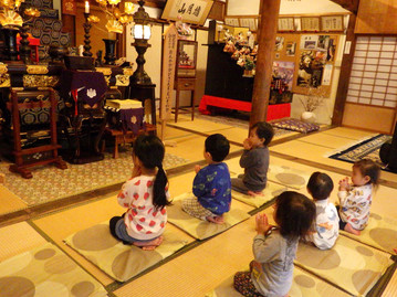 本堂でおつとめをした後、飾ってあるひな人形を近くでみることができ、ひとつひとつの人形の表情や着物、持ち物などをじっくりとみていました。